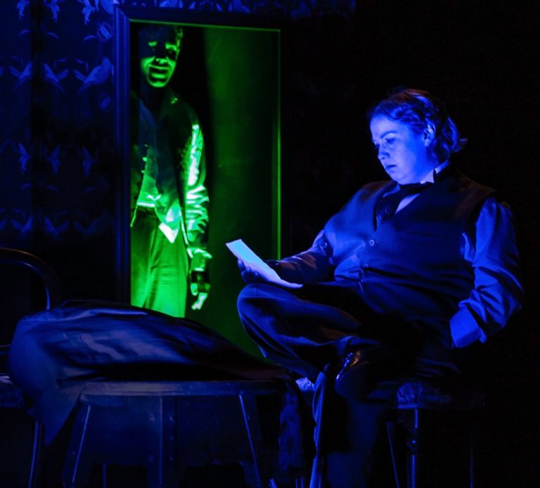The theme of duality is emphasised visually through a mirror flat positioned downstage right. Designed as an optical illusion, it appears to function as a normal mirror for much of the performance. During key transformation moments, however, Jekyll and Hyde step through it, revealing the mirror as a physical and symbolic threshold. As Hyde gains control later in the play, Jekyll appears trapped within the mirror, creating a visual metaphor for his fractured identity and loss of control.